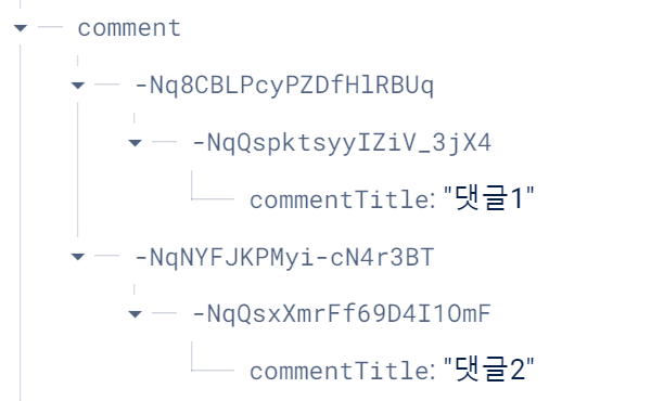 게시물들 각각에 대한 댓글들을 입력할수있어야되니깐 파이어베이스 구조를 아래와 같이 해줄것이다