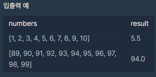 정수 배열 numbers가 매개변수로 주어집니다. numbers의 원소의 평균값을 return하도록 solution 함수를 완성해주세요.