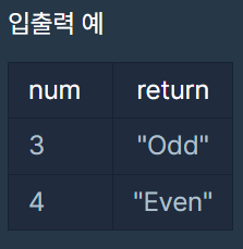 정수 num이 짝수일 경우 "Even"을 반환하고 홀수인 경우 "Odd"를 반환하는 함수, solution을 완성해주세요.
