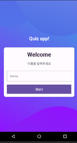 이름을 적고 start버튼을 누르면 다음 엑티비티로(QuizQuestionActivity) 넘어가도록했다