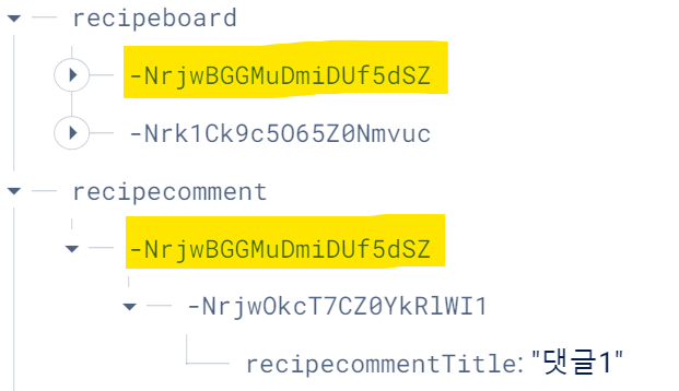 우리가 찾고자했던 레시피게시물에 해당하는 key값도 실제 레시피게시물에 해당하는 key값과 일치하는것을 확인할수있다!!