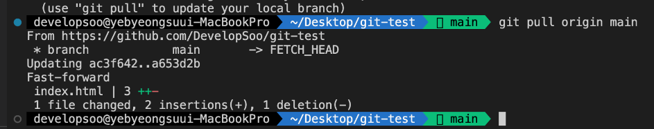 내 컴퓨터에서는 아직 합쳐져있지 않기 때문에, git pull 명령어를 사용해서, 내 컴퓨터에도 깃허브의 코드와 똑같이 맞춰줘야함 (그러면 내컴퓨터에도 merge적용됨)