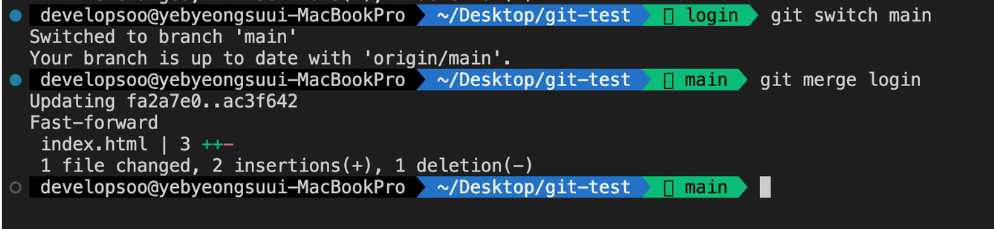 -> git switch main 을 써서 main으로 이동한뒤에, git merge login을 사용해서 main에 login브랜치를 합친다