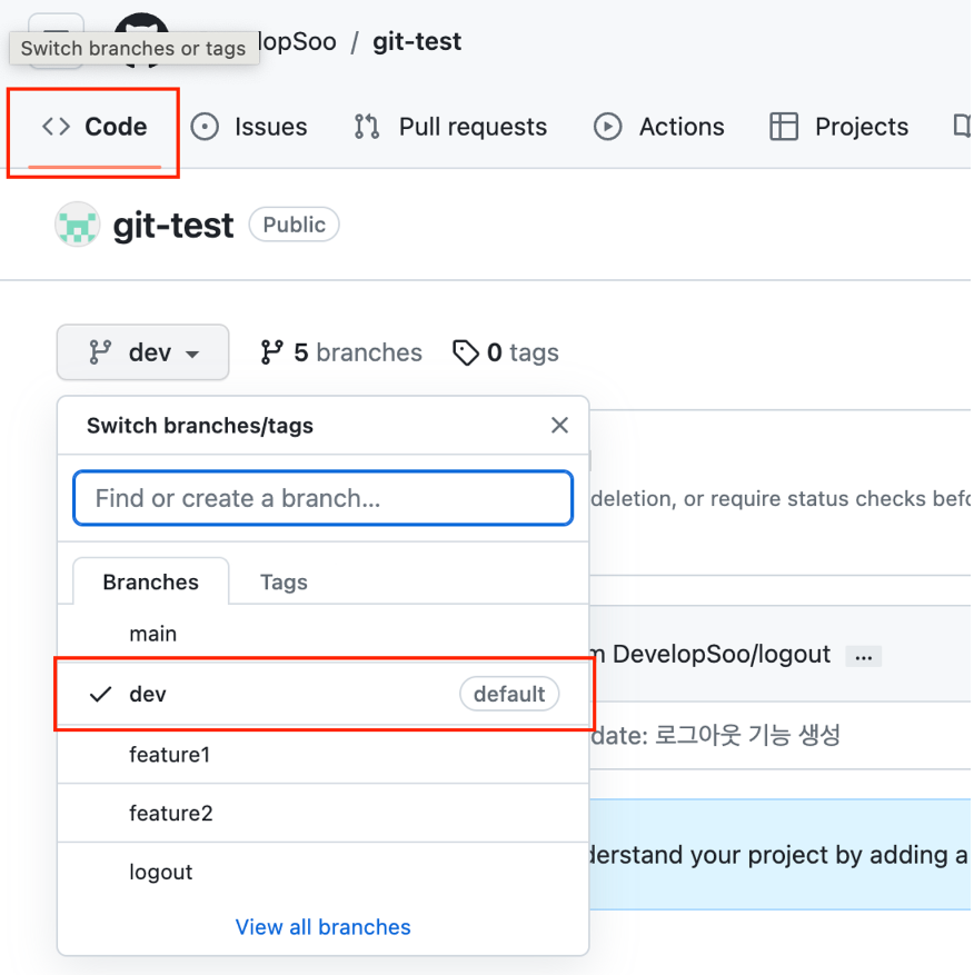 - Code 탭의 기본 브랜치 확인