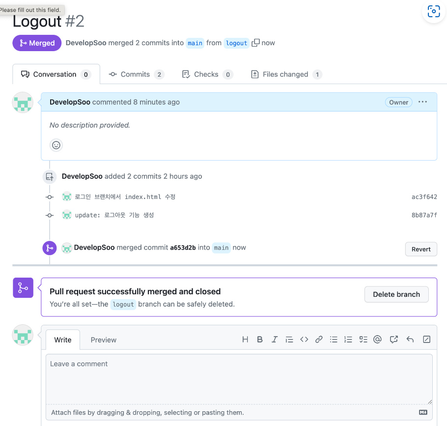 -> merge 완료 화면 (깃허브에 있는 최종브랜치(main)에 합쳐진것, 내 컴퓨터에선 아직 합쳐지지 않음)