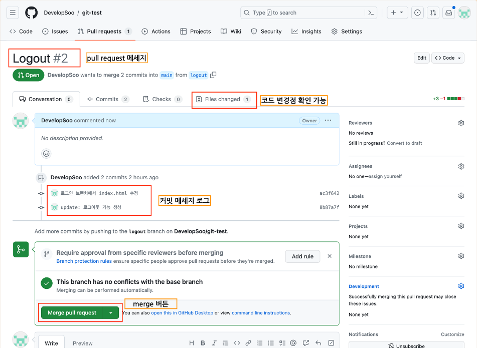 pull request는 코드를 "기본 브랜치(main)로 당겨와 합치는것을 요청한다" 라는 뜻이다