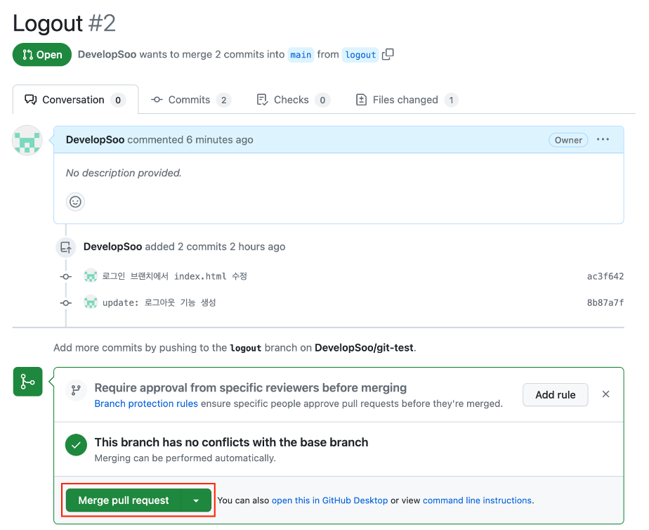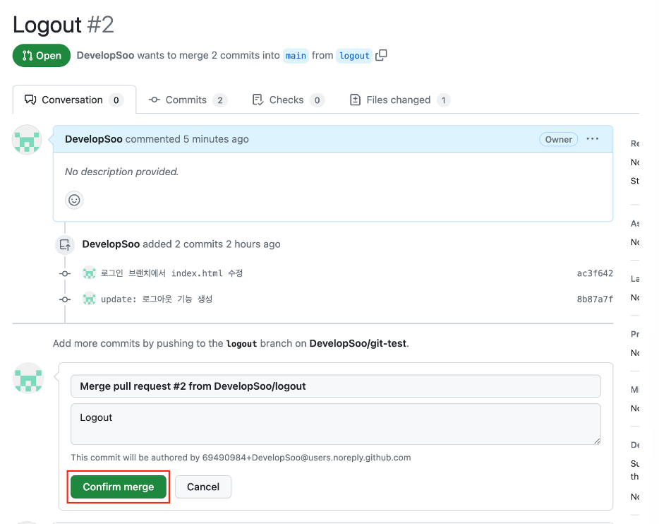 - 깃허브에서 merge (Merge pull request 클릭 -> Confirm merge 클릭)