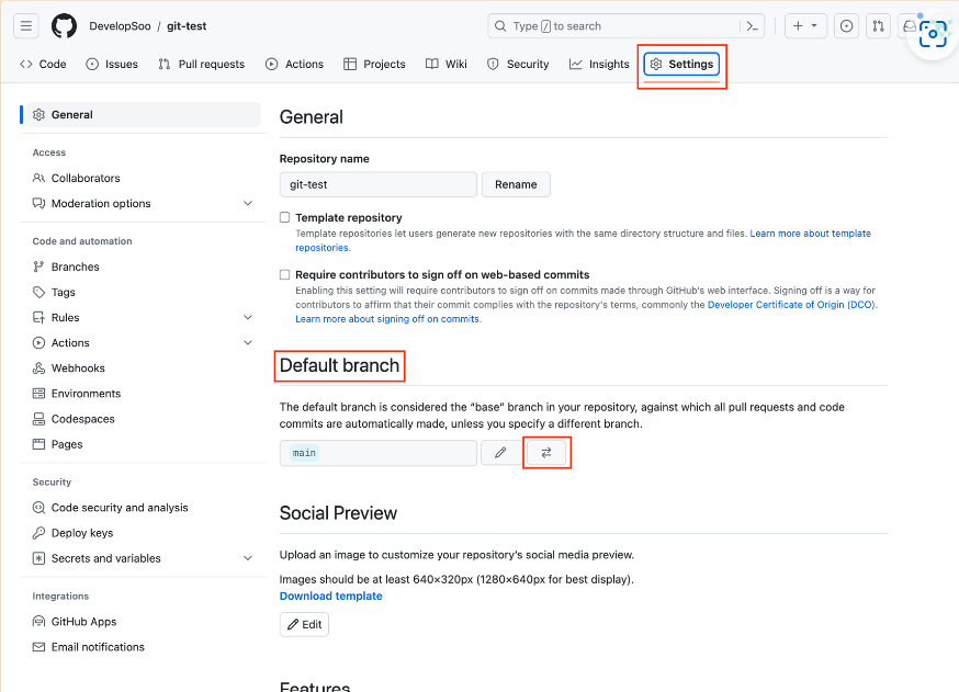 - Settings -> Defalt Branch에서 화살표버튼 클릭