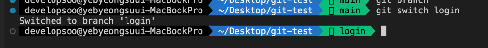 -> Switched to branch "login" 이라고 뜨면서, login브랜치로 이동한것을 볼수있다
