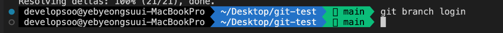 다시 git branch를 쳐서 현재 내위치를 확인해보면, 현재 내가 위치해있는 브랜치가 login인것을 확인할수있다