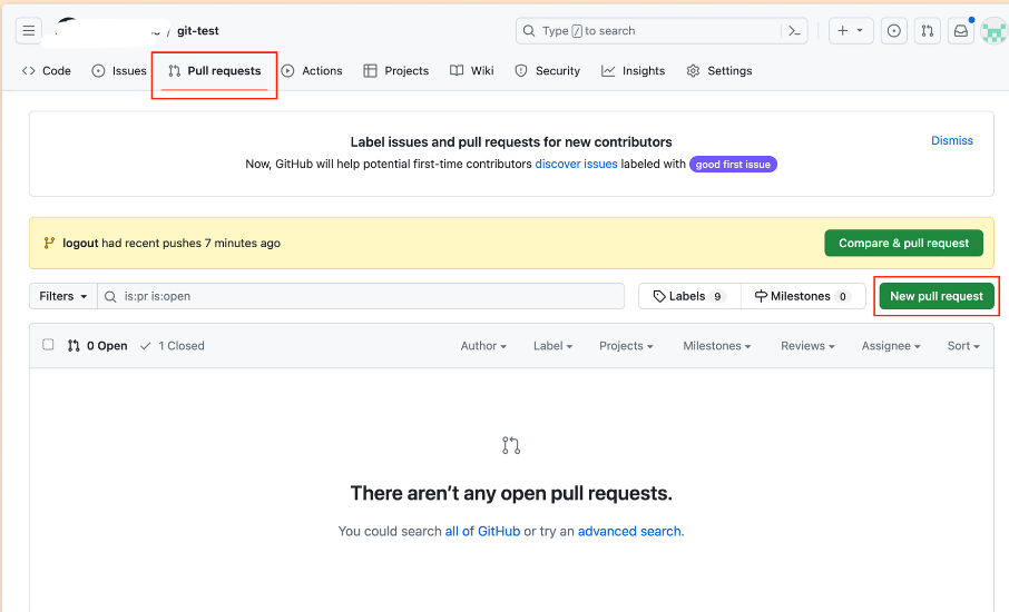 -> Pull request 탭 클릭후, New pull request 누르기