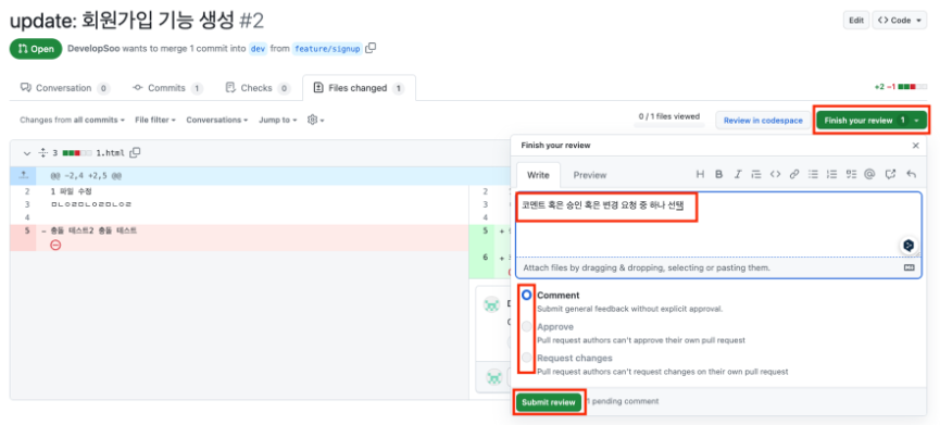 3. Finish your review 클릭 및 Comment(코멘트), Approve(변경 승인), Request Changes(변경 요청) 중 하나 선택 후 Submit review 클릭