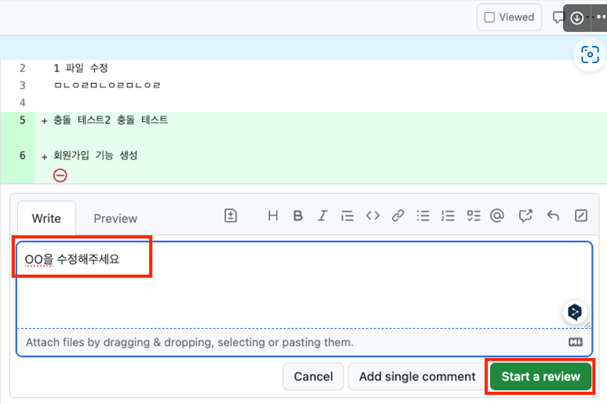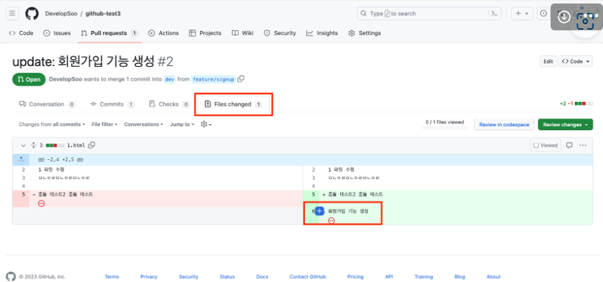 1. File changed로 이동 후 리뷰할 부분 선택 ( + 선택해서)