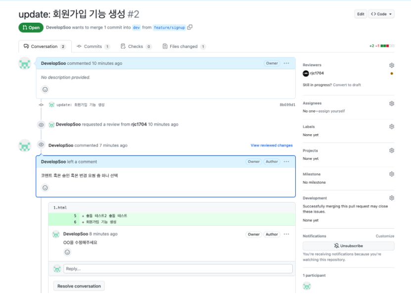 - Pull requests탭의 Reviewers에서 리뷰요청