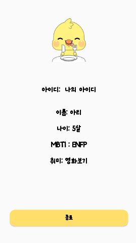 - 종료 버튼이 눌리면 SignInActivity로 이동하도록 구현합니다. (finish 활용)