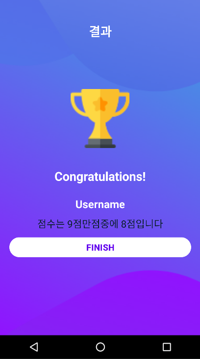 그리고 마지막에 질문이 다 끝났을때 Finish버튼을 누르면 이동하는 화면을 만들었다
