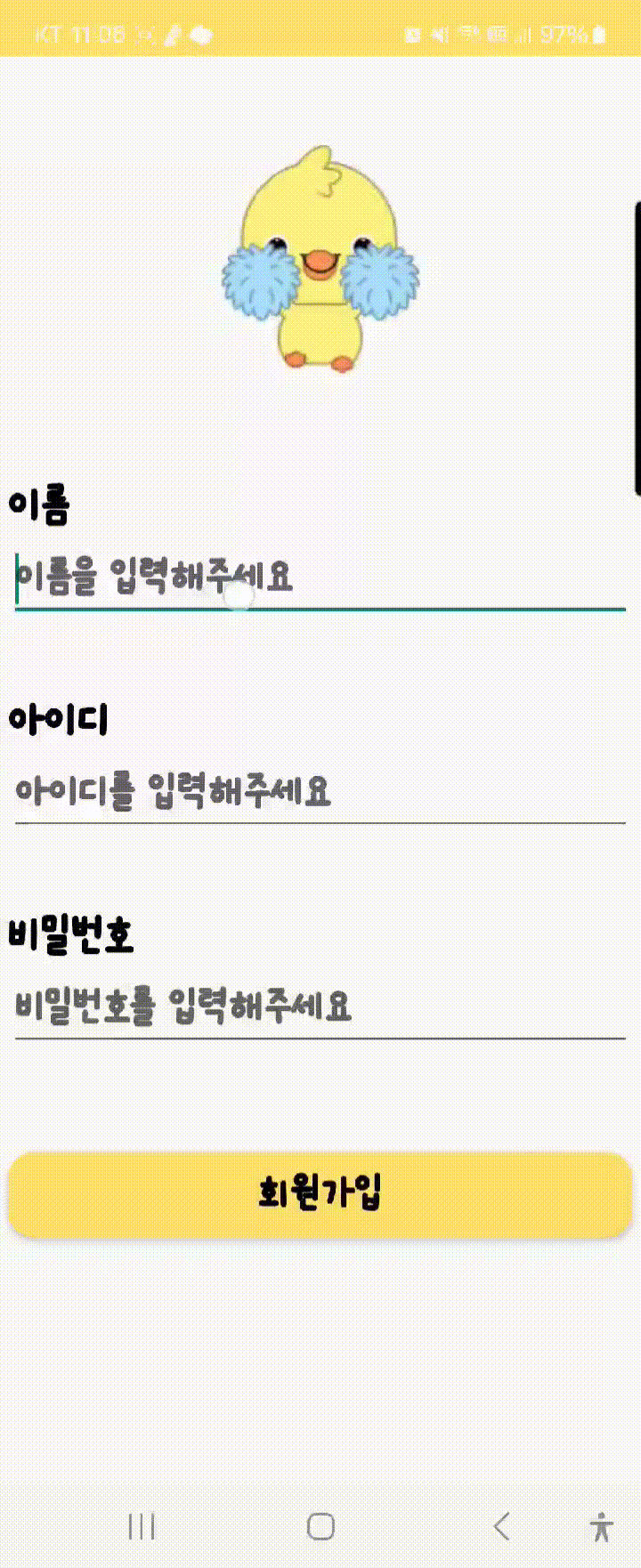 회원가입에서 입력한 아이디/비밀번호가 버튼을 눌러 로그인화면으로 이동했을때 자동으로 로그인화면에 반영되는것을 확인할 수 있다