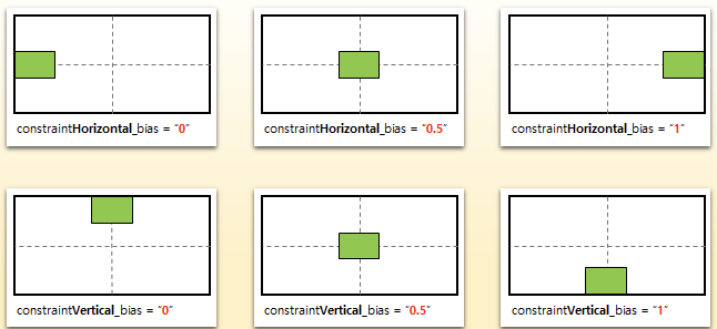 - layout_constraintHorizontal_bias : 수평 방향(Left/Right 또는 Start/End) 사이드 제약 시, 양 사이드 간 위치 비율
