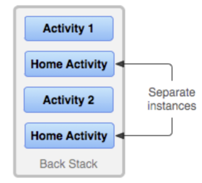 백 스택의 활동은 결코 재정렬되지 않으므로, 앱에서 사용자가 두 개 이상의 활동에서 특정 활동을 시작할 수 있도록 허용하는 경우 활동의 이전 인스턴스를 맨 위로 가져오는 것이 아니라, 활동의 새 인스턴스가 생성되어 스택으로 푸시된다. 따라서 앱의 한 활동은 그림처럼 다른 작업에서도 여러 번 인스턴스화될 수 있다