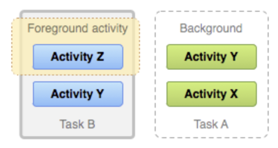 - 홈 화면이 표시되면 태스크A가 백그라운드로 전환됩니다. 새 앱이 시작되면 시스템은 자체 활동 스택과 함께 그 앱 (태스크 B)의 작업을 시작한다.