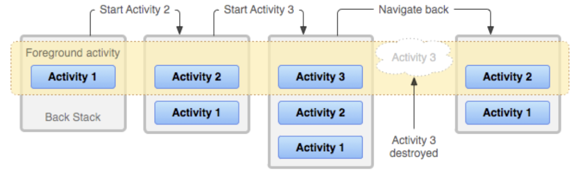 실행된 엑티비티의 인스턴스들은 자료구조의 Stack구조로 저장되어 태스크에 속하게 되는데, 안드로이드 시스템에서는 이 스택을 Back Stack이라고 부른다