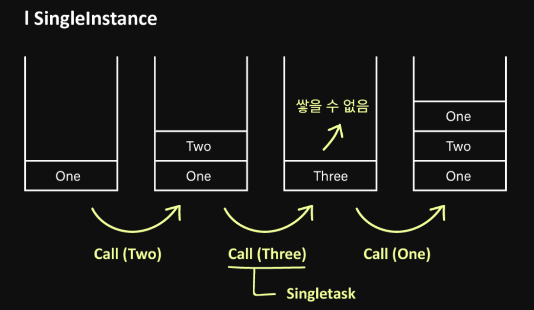 - 새로 생긴 스택 공간에는 다른 엑티비티 스택이 쌓이지 않는다