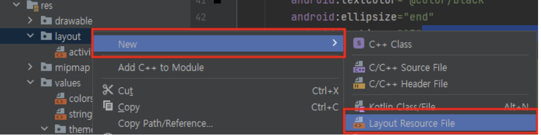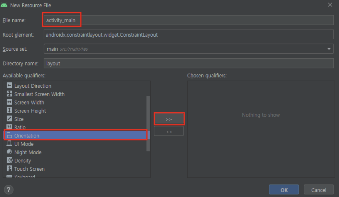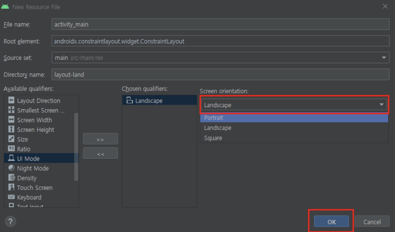 layout -> New -> Layout Resource File -> File name은 세로모드 이름과 똑같이 써주기 -> orientation -> landscape