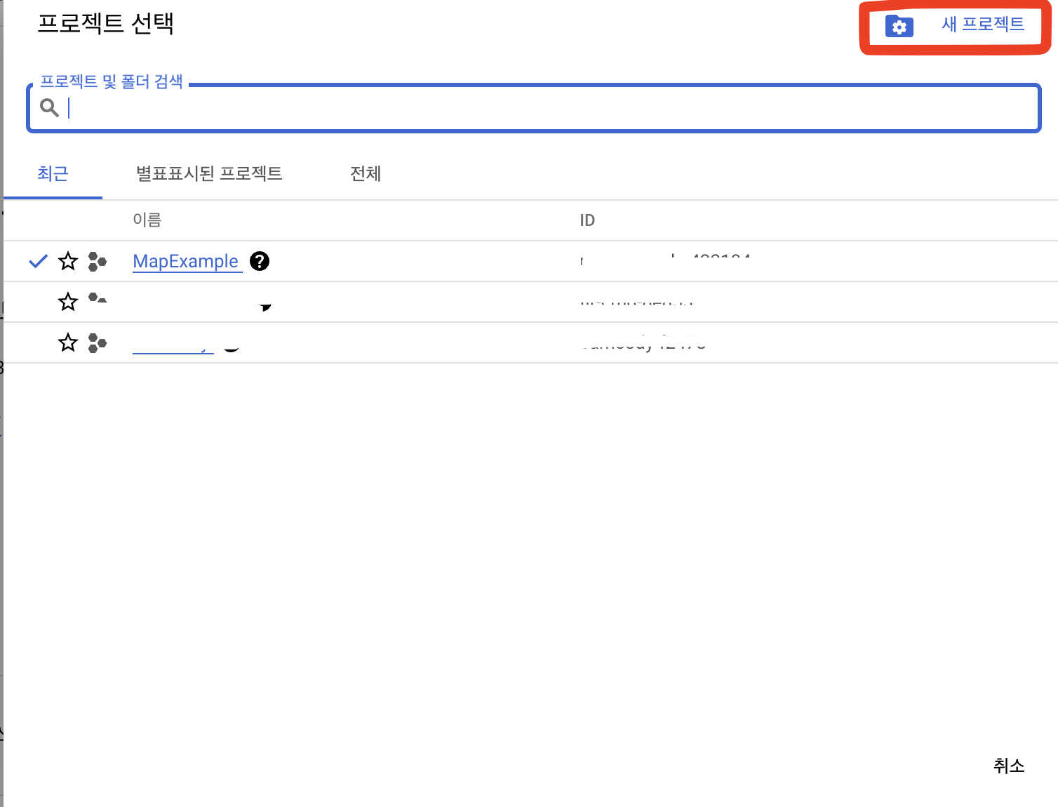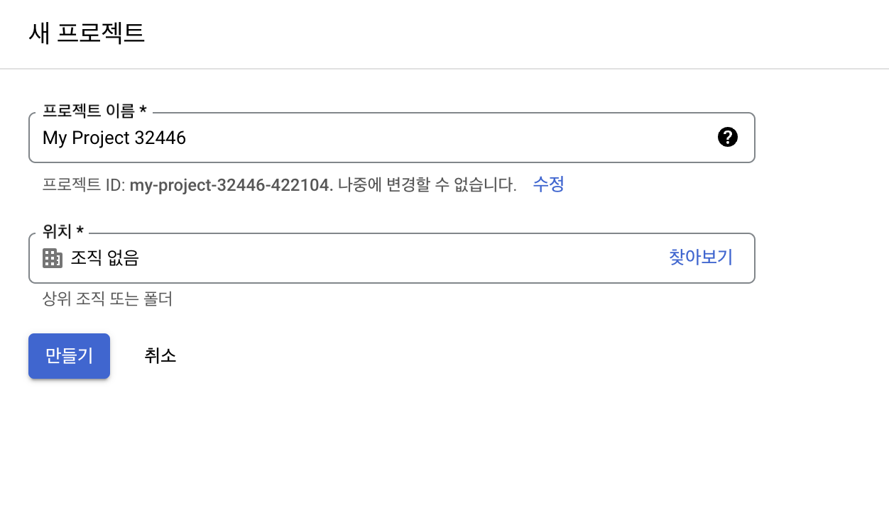 프로젝트가 생성되어있지 않다면 새프로젝트를 눌러서, 이름을 적고 새 프로젝트를 생성해준다