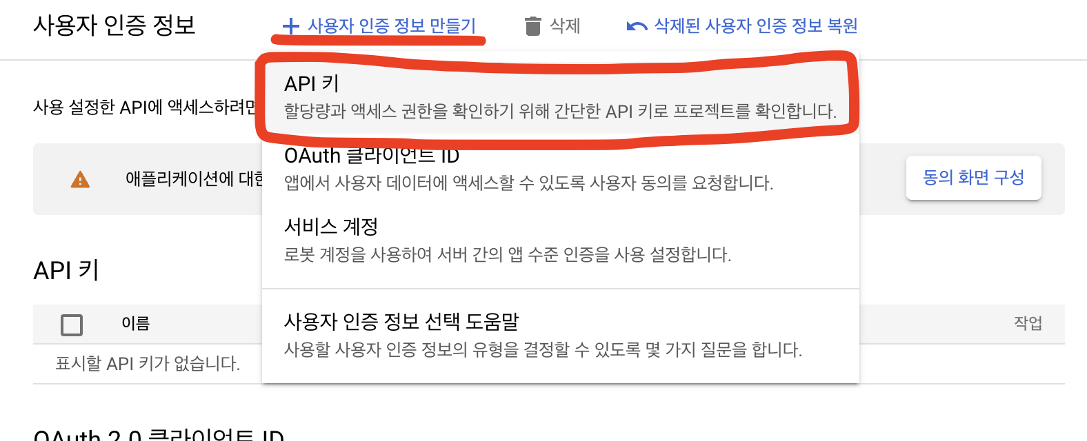 API 키가 생성되었다 (지금은 API키 제한을 안걸어두었지만, 제한을 걸어서 사용해줄 수도 있다)