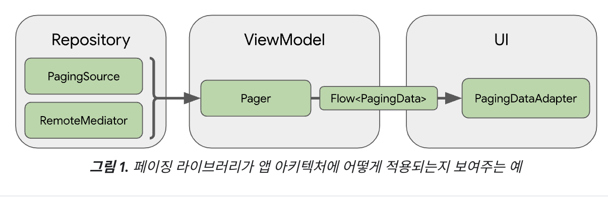 Paging3는 프로젝트의 적절한 관심사 분리를 요구하며 안드로이드 권장 아키텍처에 통합되도록 만들어졌다.