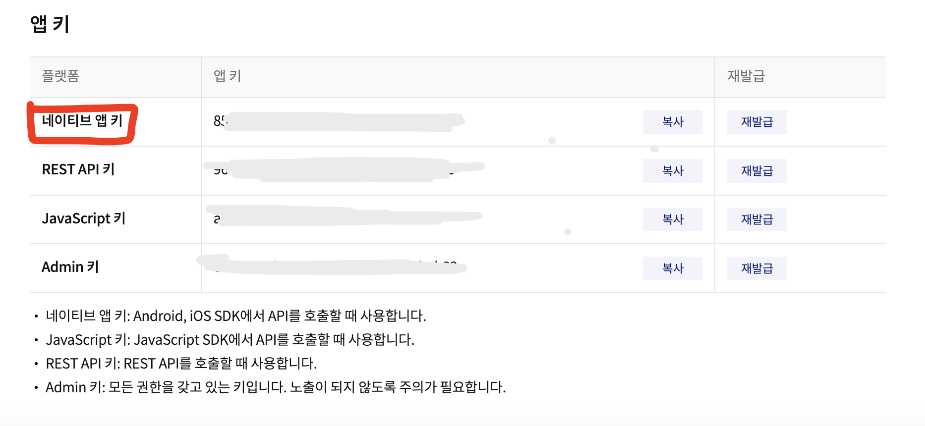 왼쪽바쪽에 있는 앱키를 누르면 네이티브 앱키가 보일것이다