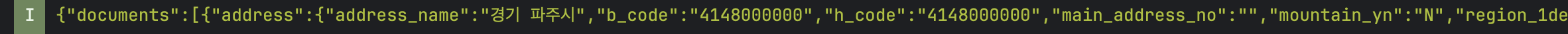 이제 값을 잘 받아오는지 확인하기위해서 검색 부분에 "파주"를 입력하고 로그를 확인해보면 아래와같이 파주에 해당하는 값을 잘 받아오는것을 확인할 수 있다