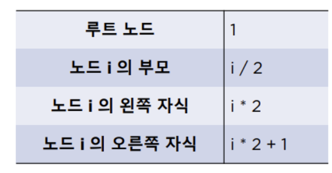 위의 그림처럼 트리를 1차원배열로 표시한다고했을때, 루트에서 시작해서 왼쪽노드부터 오른쪽노드까지 순서를 매기면, 완전이진트리 같은경우에는 빈숫자가 없게 된다.