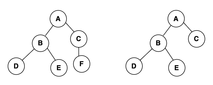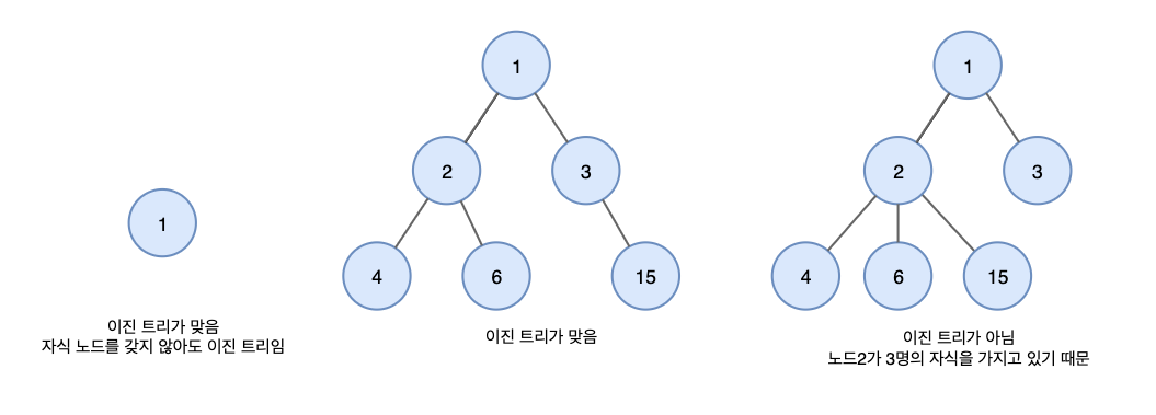 그래서 같은 루트에 같은 자식노드 하나를 가지고있어도, 자식노드의 위치가 왼쪽과 오른쪽이 다르다면 이 두 트리는 서로 다른 트리가된다.