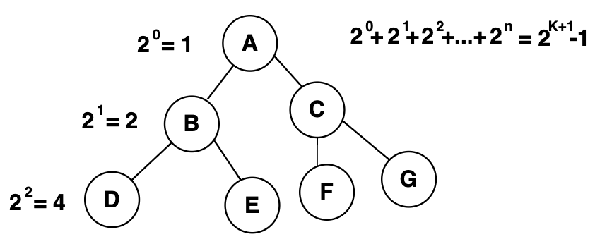 포화 이진트리는 높이가 k인 포화 이진트리에서 노드의 개수는 아래와같은 특징을 갖는다