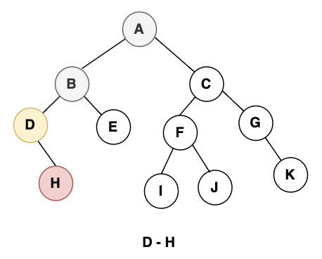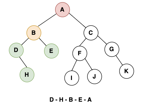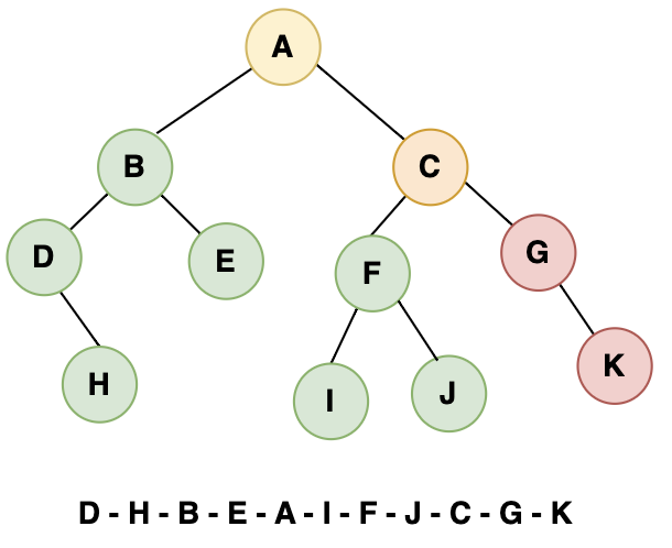 따라서 결과적으로 D - H - B - E - A - I - F - J - C - G - K의 순서로 중위탐색이 이루어지는것을 확인해볼 수 있다.