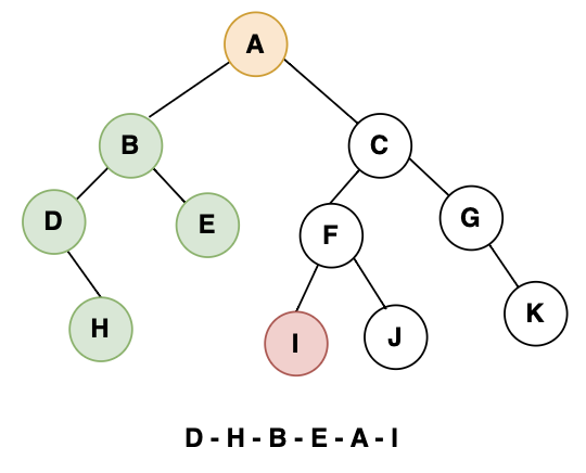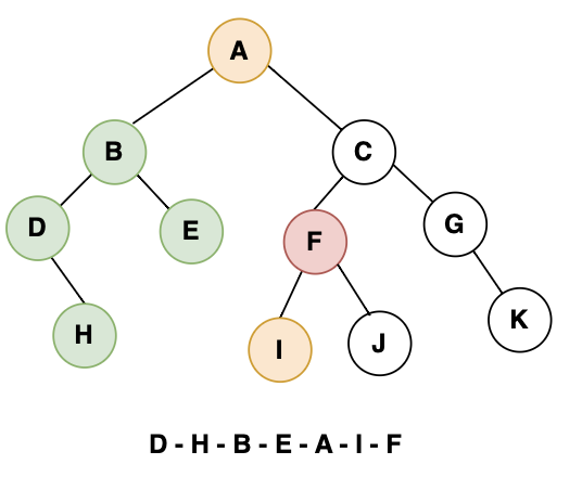 근데 F노드도 자식을 갖고있기때문에 F노드를 기준으로 왼쪽의 서브트리부터 탐색해야하기 떄문에 I를 탐색한다.