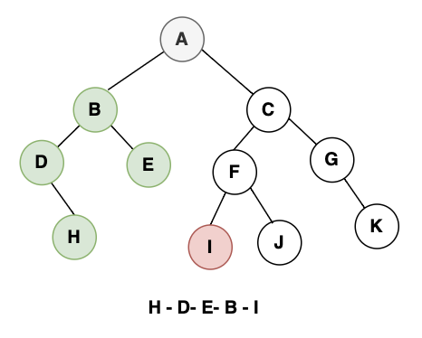그래서 A노드부터 시작하고, A노드의 왼쪽 서브트리인 B노드로 이동한다. B노드도 자식을 갖고있기때문에 왼쪽 자식인 D노드로 이동하게된다. D노드는 더이상 이동할 왼쪽 자식이 없기때문에 바로 오른쪽 서브트리인 H노드로 이동하게된다.