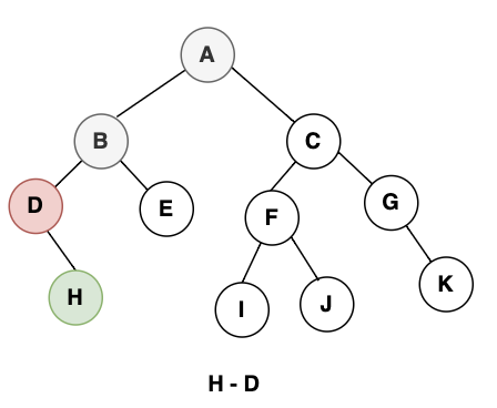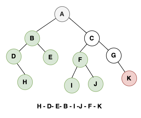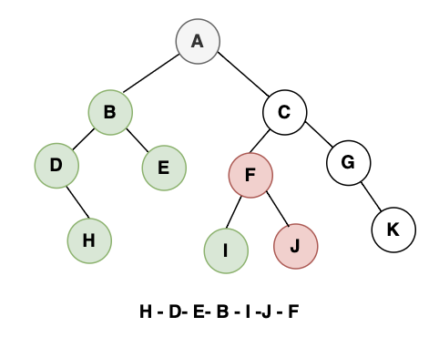 따라서 결과적으로 H - D - E - B - I - J - F - K - G - C - A의 순서로 노드탐색이 이루어지는것을 확인할 수 있다.