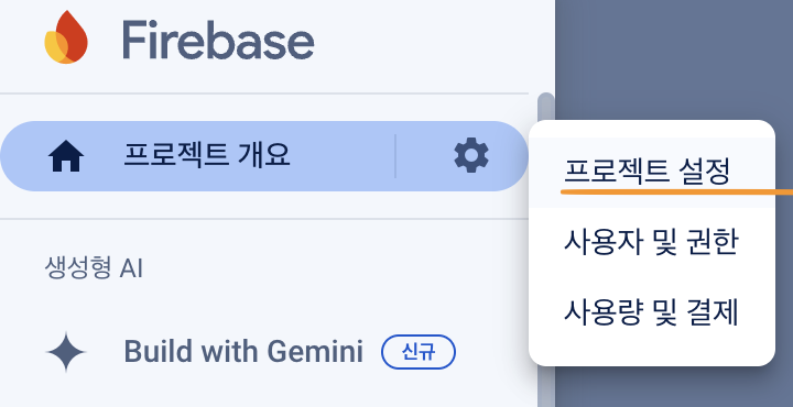 해당 프로젝트와 연결된 파이어베이스를 열어서 프로젝트 설정으로 들어간뒤