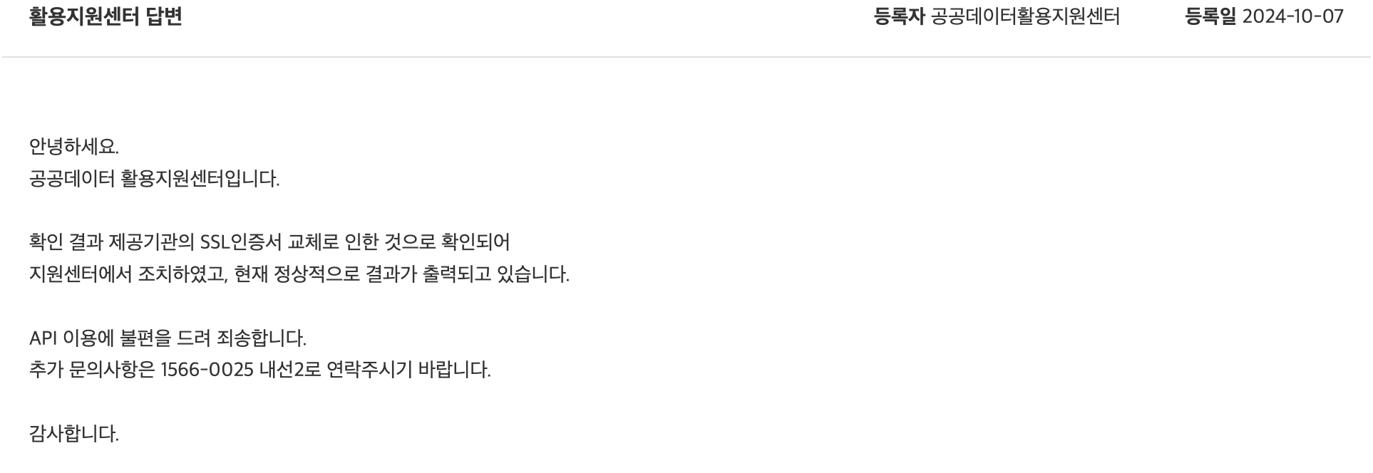 다른사람들 문의내용도 보니깐 해당 에러가 난 사람들이 많아서 공공데이터포털에 지금 이런오류가 많이 발생하는것같다