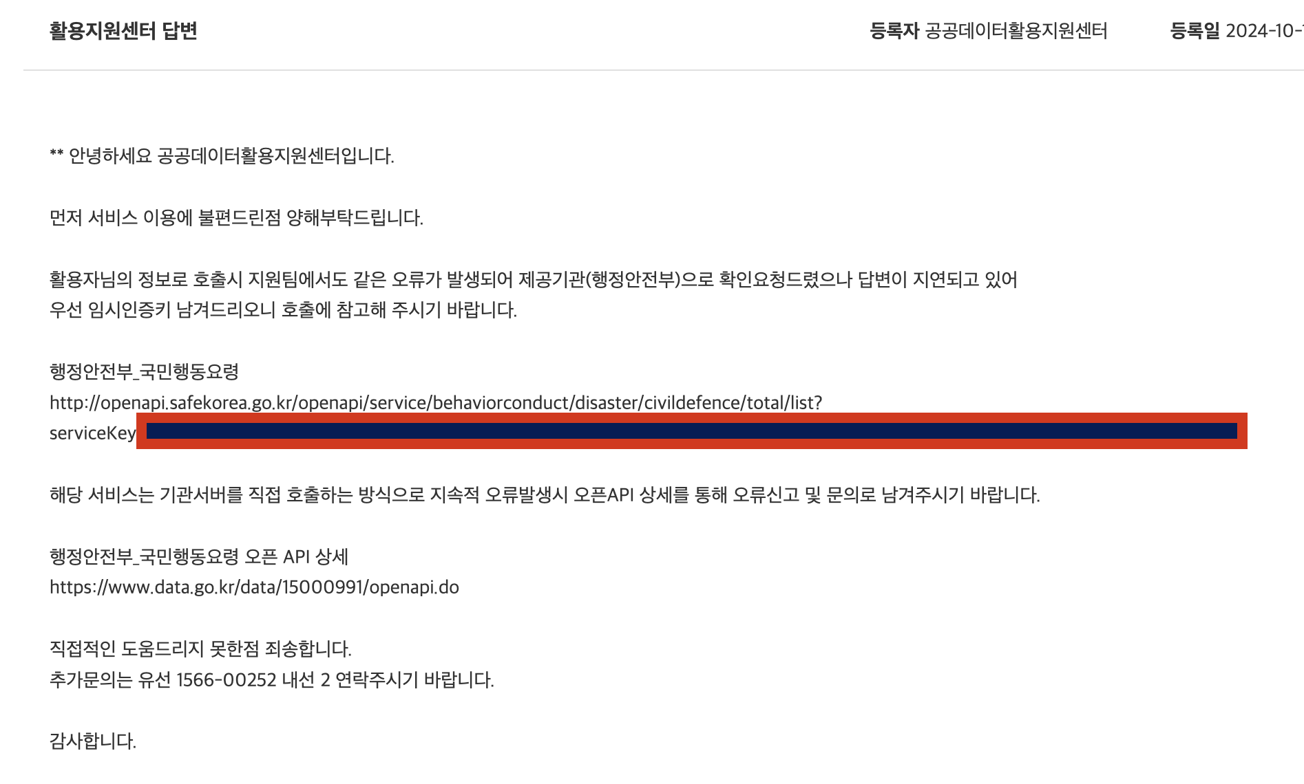 근데 국민행동요령 API를 받아오는도중 며칠동안 계속 SERVICE KEY IS NOT REGISTERED ERROR해당 오류가 발생해 공공데이터포털에 문의하였다.