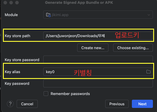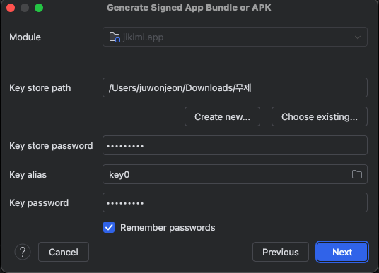 - Key store path: /Users/juwonjeon/Downloads/무제 (이전에 사용했던 keystore 경로 입력).