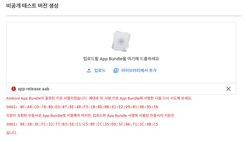 지문이 포함된 인증서로 App Bundle에 서명해야 하지만, 업로드한 App Bundle 서명에 사용된 인증서의 지문은