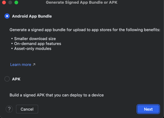 1.Signed Bundle/APK 생성 메뉴로 이동: 상단 메뉴에서 Build > Generate Signed Bundle / APK를 클릭.