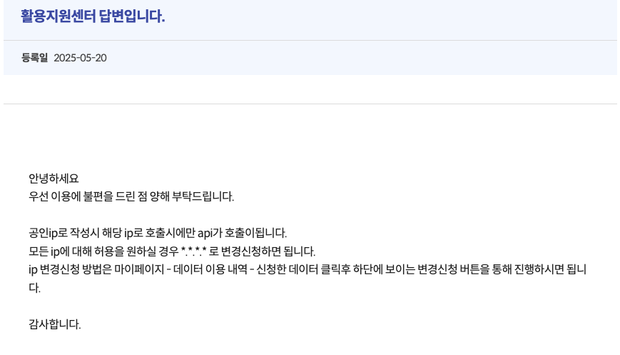 긍까 뭐냐면 개인ip로 등록을해서 집에서하면 데이터가 잘 호출이 됐는데, 밖에서 하면 호출이 안됐음