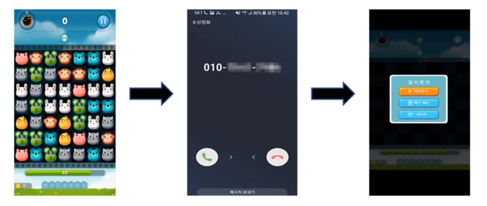 휴대폰으로 게임을하고있는 도중에 전화가 왔다고 해보자